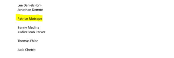 Le 23 octobre 2014, Unik Ernest envoie à Epstein une liste de contacts internationaux pour un projet économique (document EFTA02591377.pdf). La liste est variée : financiers, hommes d’affaires africains et moyen-orientaux, et même quelques célébrités hollywoodiennes. Parmi eux figure Patrice Motsepe, qui deviendra président de la CAF en 2021.