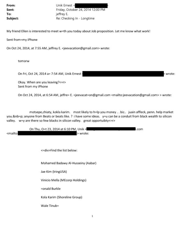 Le lendemain, le 24 octobre 2014 à 6h54, Epstein répond en hiérarchisant ces profils. Son message indique ses priorités : “Motsepe, Chiaty, Kola Karim : les plus susceptibles de vous aider avec de l’argent… dans les affaires. Ben Affleck, Penn : pour vous aider à vous promouvoir (…) Vous pouvez vous servir de pont entre la richesse noire et la Silicon Valley.”