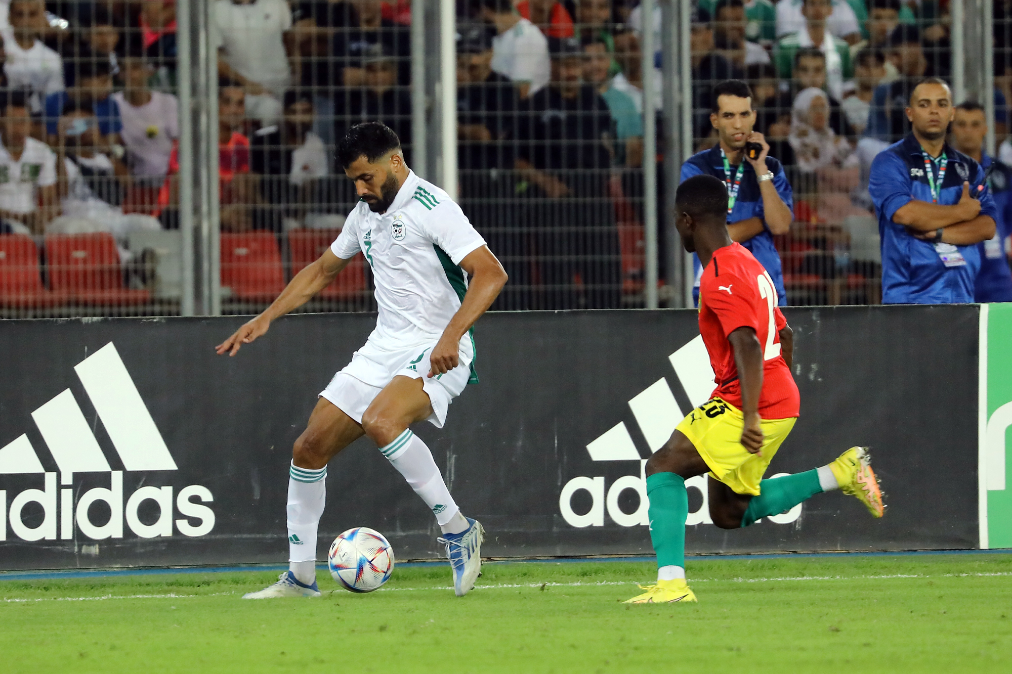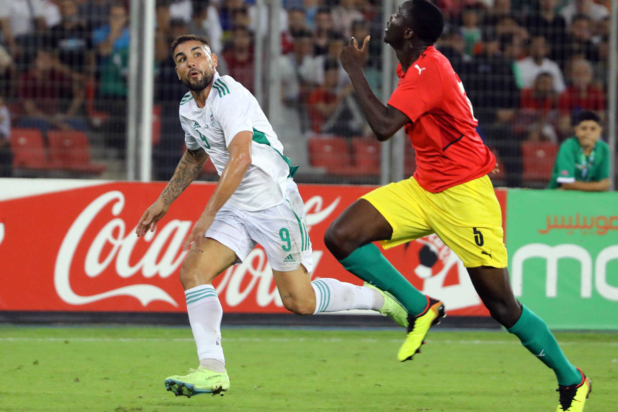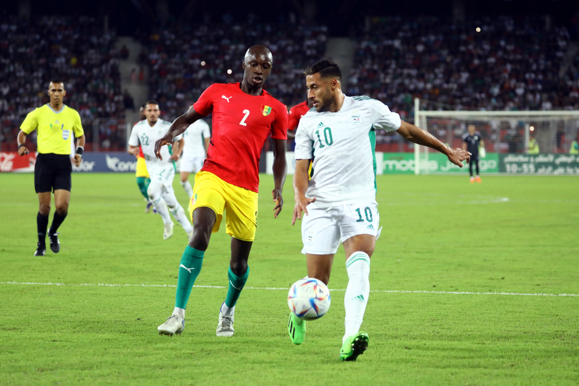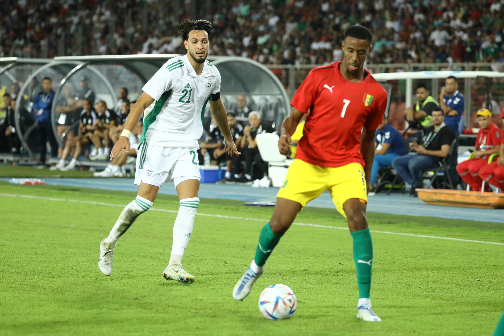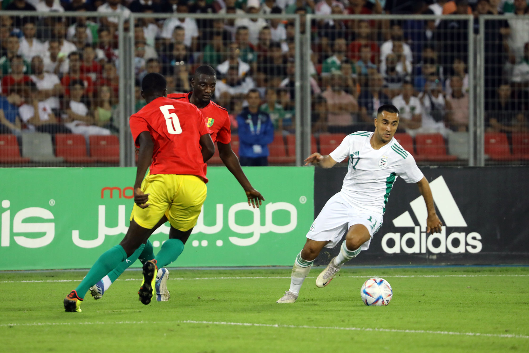 Pour le retour des Verts à Oran, dix-sept ans après, à l’occasion de la réception de la Guinée au Stade Miloud Hadefi, Djamel Belmadi a décidé de présenter une équipe new-look à un public « oranais » qui vivait cet événement avec toute la ferveur et la joie de vivre qu’on lui connait. Des habituels titulaires, seuls Bensebaini, Bedrane et Bennacer débutaient. Articulée derrière Andy Delort, seul en pointe, dans son système habituel en 4-3-3, l’équipe nationale aura franchement du mal durant la première mi-temps à asseoir son jeu. Et sa domination. Pis, elle buttera sur une équipe guinéenne solide et agressive à souhait. Ce qui a fortement gêné l’évolution du onze algérien sur le terrain. Cette mauvaise entame de match des Algériens est cristallisée par le raté monumental de Mohamed Bayo qui, dès la deuxième minute de jeu, se retrouve seul face aux buts. Servi en profondeur, il ajuste Zeghba, mais son tir fut détourné in extremis par Bedrane. L’intervention en catastrophe de ce dernier lui coûtera sa place puisqu’il sera remplacé dans la foulée pour blessure. Le même Bayo prend de vitesse Aissa Mandi, qui remplaçait quelques minutes auparavant Abdelkader Bedrane, et manque de peu l’ouverture du score, son tir ayant rasé le montant droit du gardien des Verts (28’).