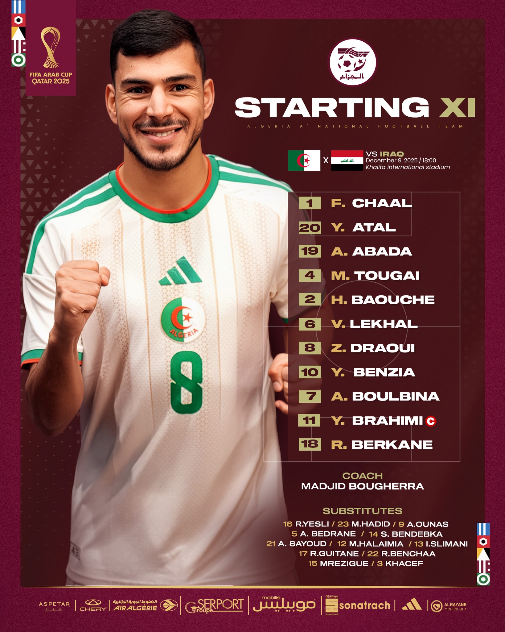 Le sélectionneur de l’Algérie A’ Madjid Bougherra a dévoilé son onze de départ pour affronter l’Irak, avec trois changements par rapport au match contre le Bahreïn. En défense, Tougai remplace Bedrane ; au milieu, Draoui prend la place de Bendebka ; tandis qu’en attaque, le capitaine Brahimi, désormais totalement rétabli, intègre le onze.