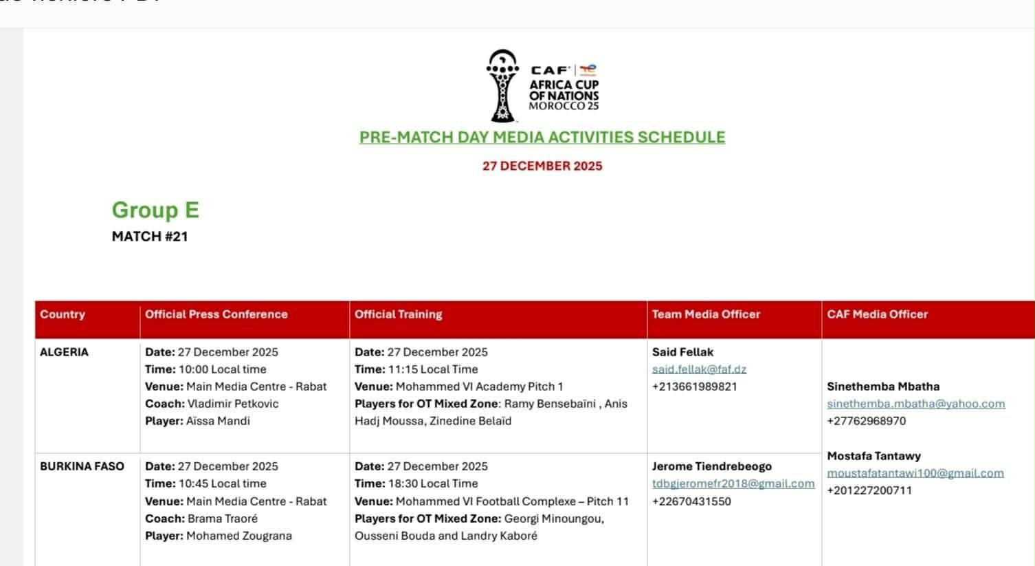 À noter enfin que la conférence de presse ainsi que la zone mixte de l’équipe d’Algérie seront retransmises en direct et en intégralité sur les plateformes de La Gazette du Fennec, permettant aux supporters de suivre ces rendez-vous en live.