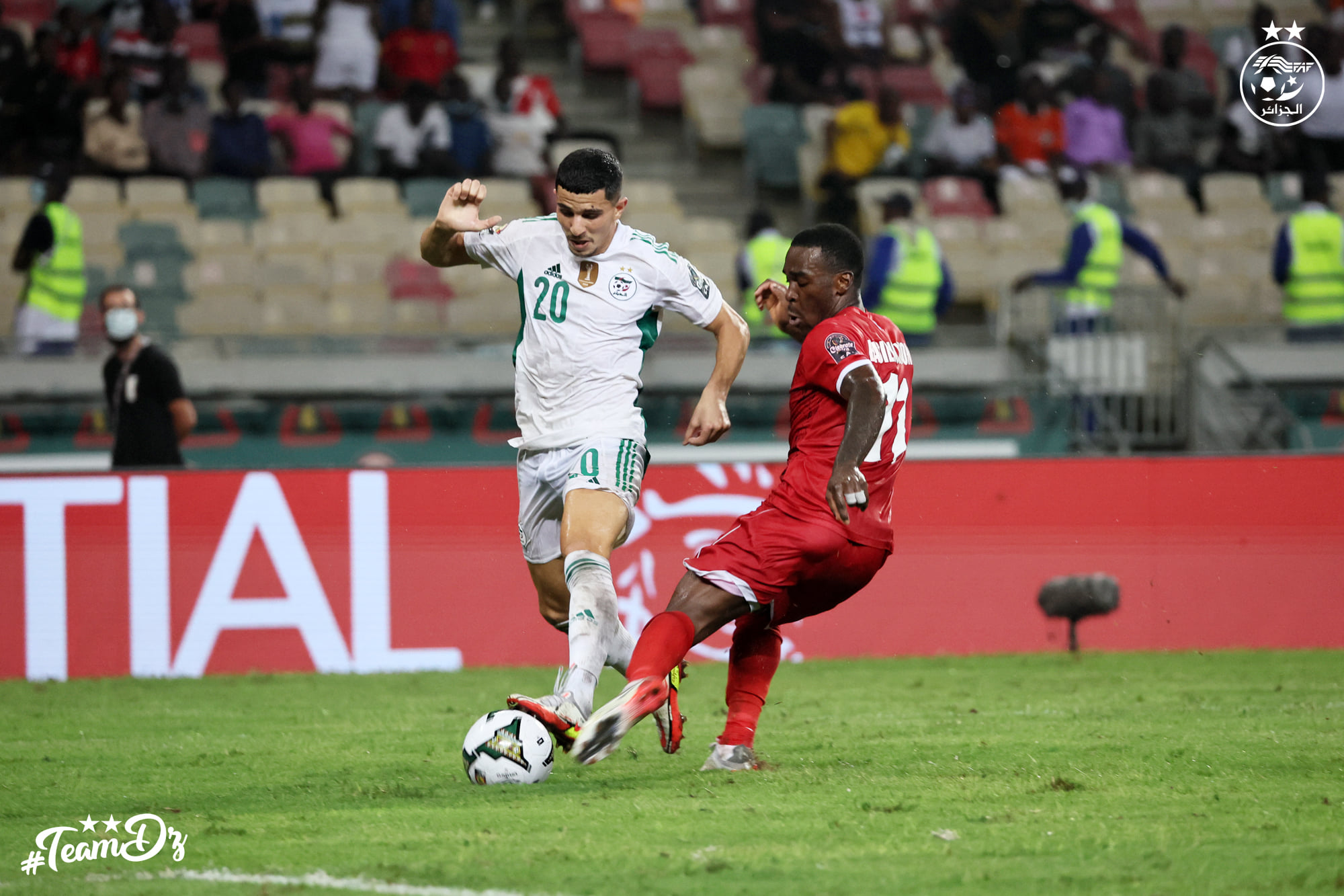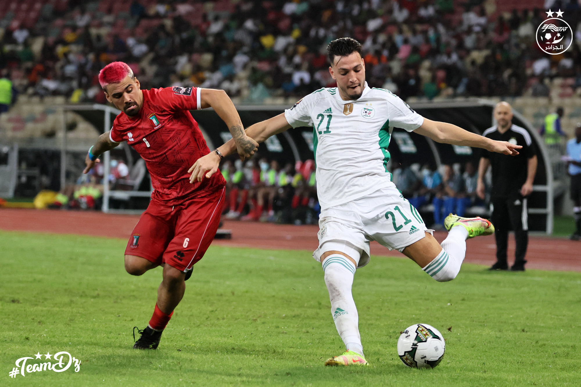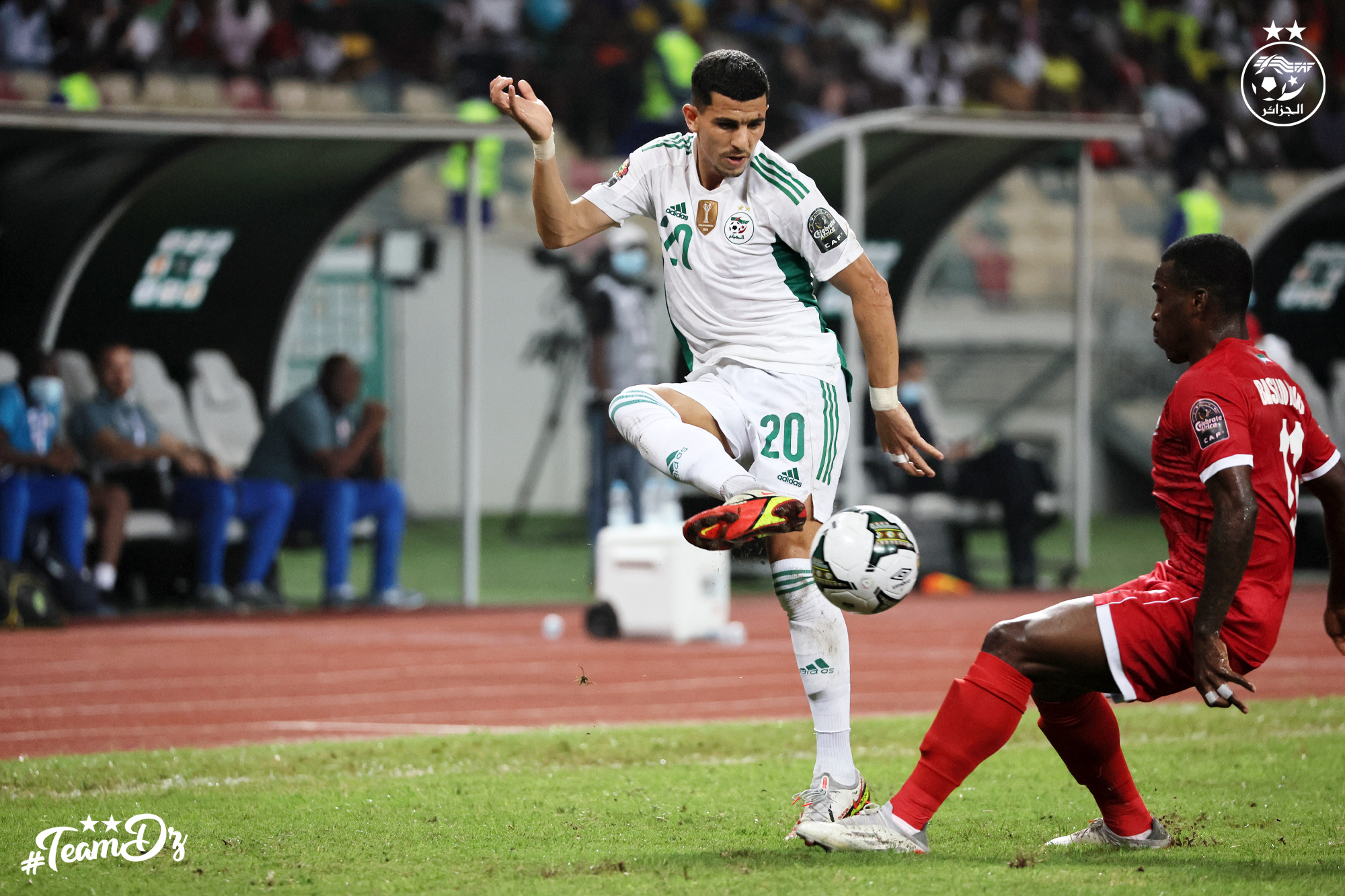 Les Equatoguinéens ont opté pour le jeu de contres face à des Guerriers du Désert qui ont mis le pied sur le ballon. L’axe du jeu étant fermé, les Algériens optent pour les couloirs. Bensebaïni centre vers Belaïli (57′). Mais la tête de ce dernier manquait de précision.