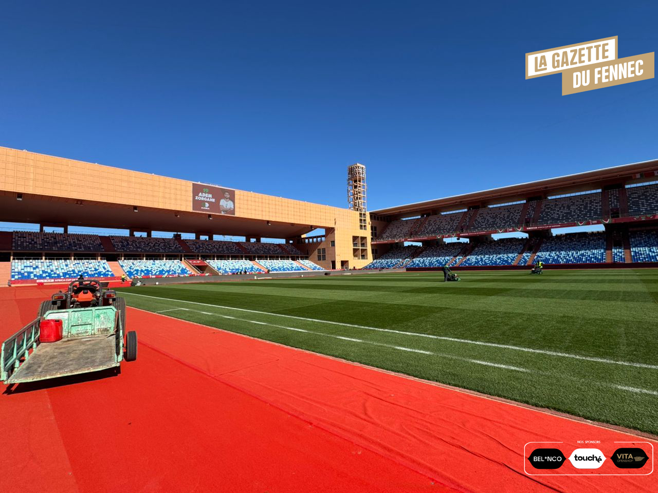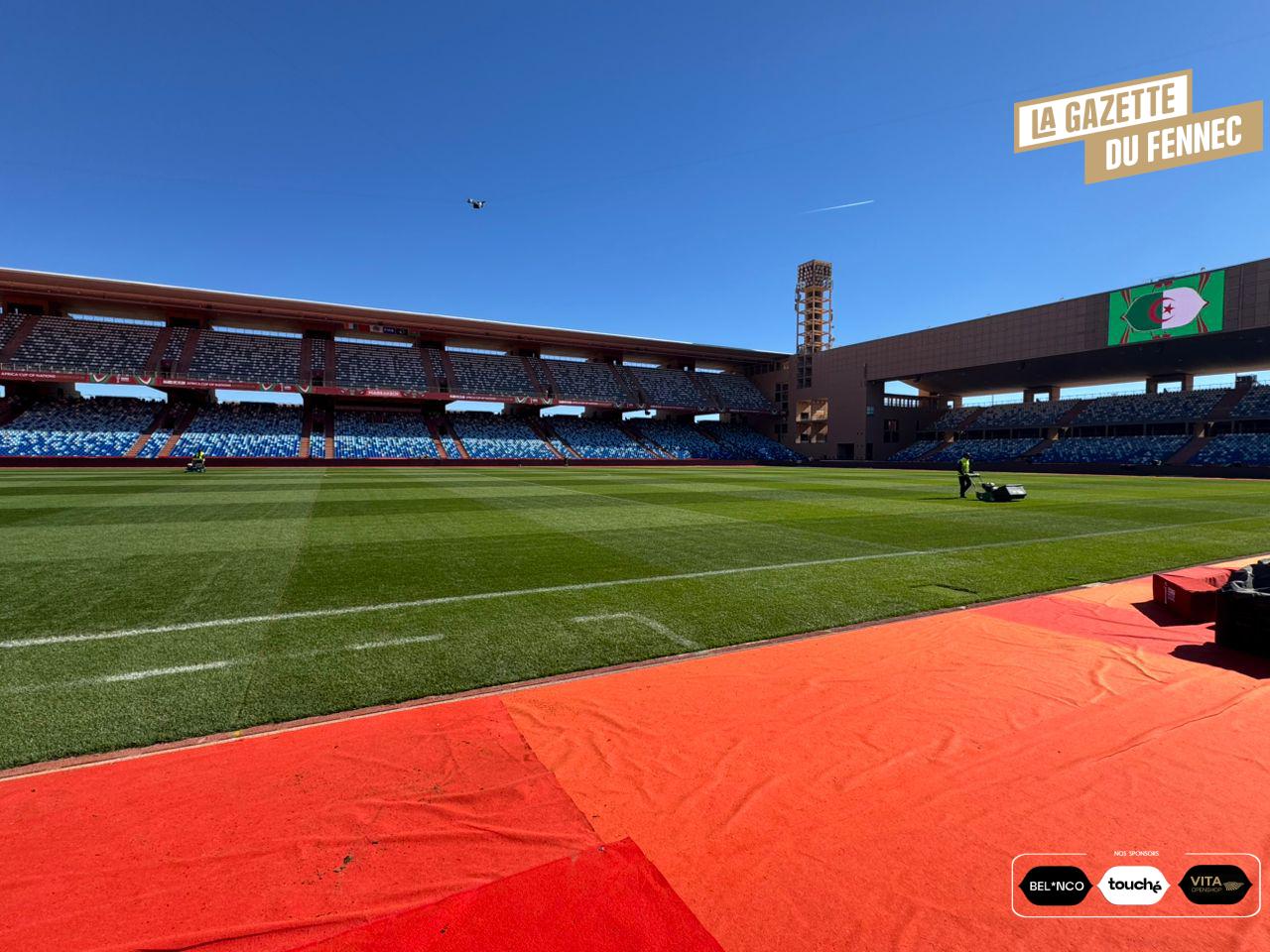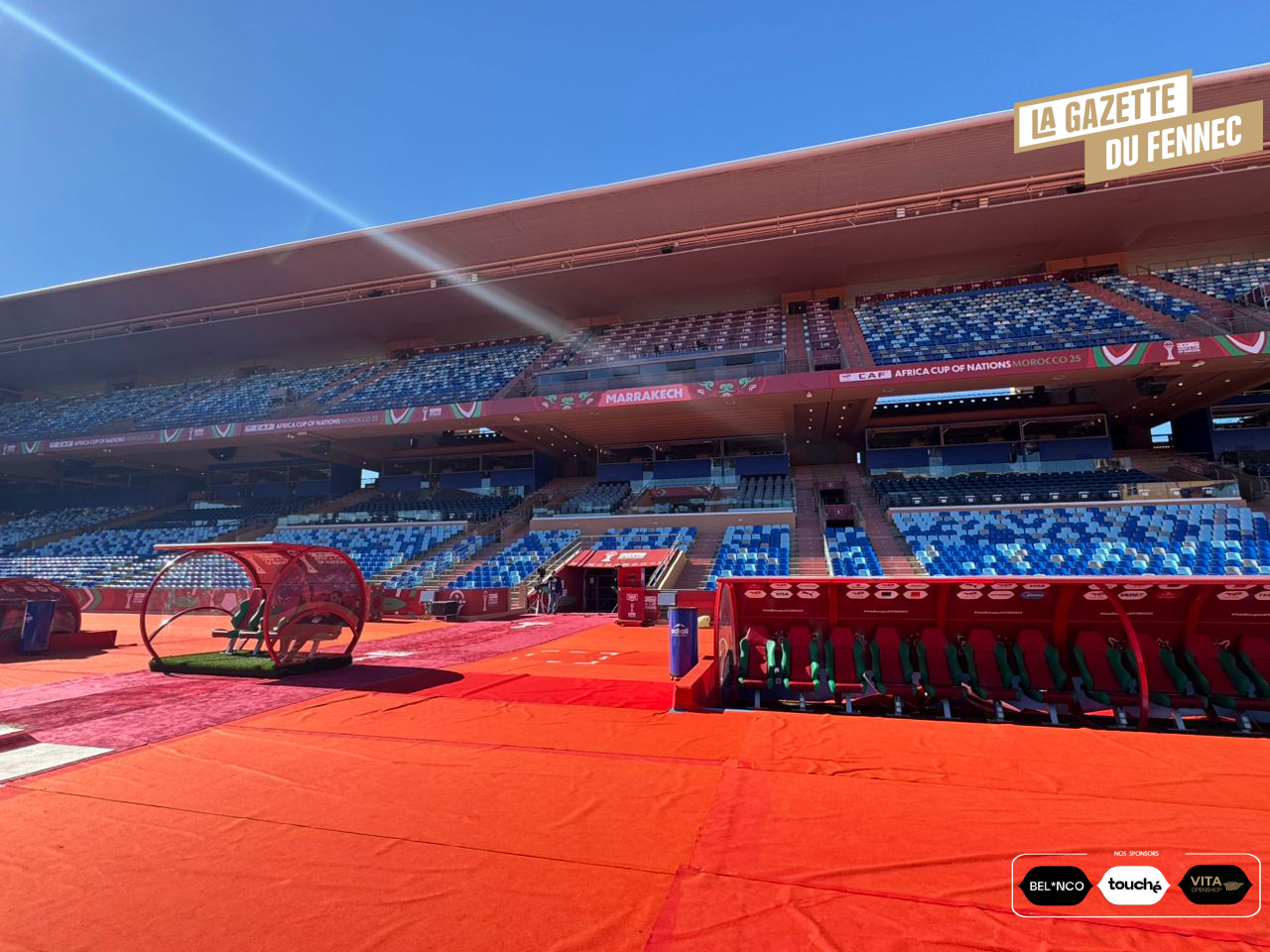 À la veille du quart de finale Algérie-Nigéria, le stade de Marrakech vit ses dernières heures de préparation. Couloirs habillés aux couleurs de la CAN, vestiaires prêts à accueillir les acteurs, pelouse impeccable et tribunes finement décorées : tout est en place. L’enceinte respire déjà l’événement, dans une atmosphère studieuse et solennelle, annonciatrice d’un grand rendez-vous continental.