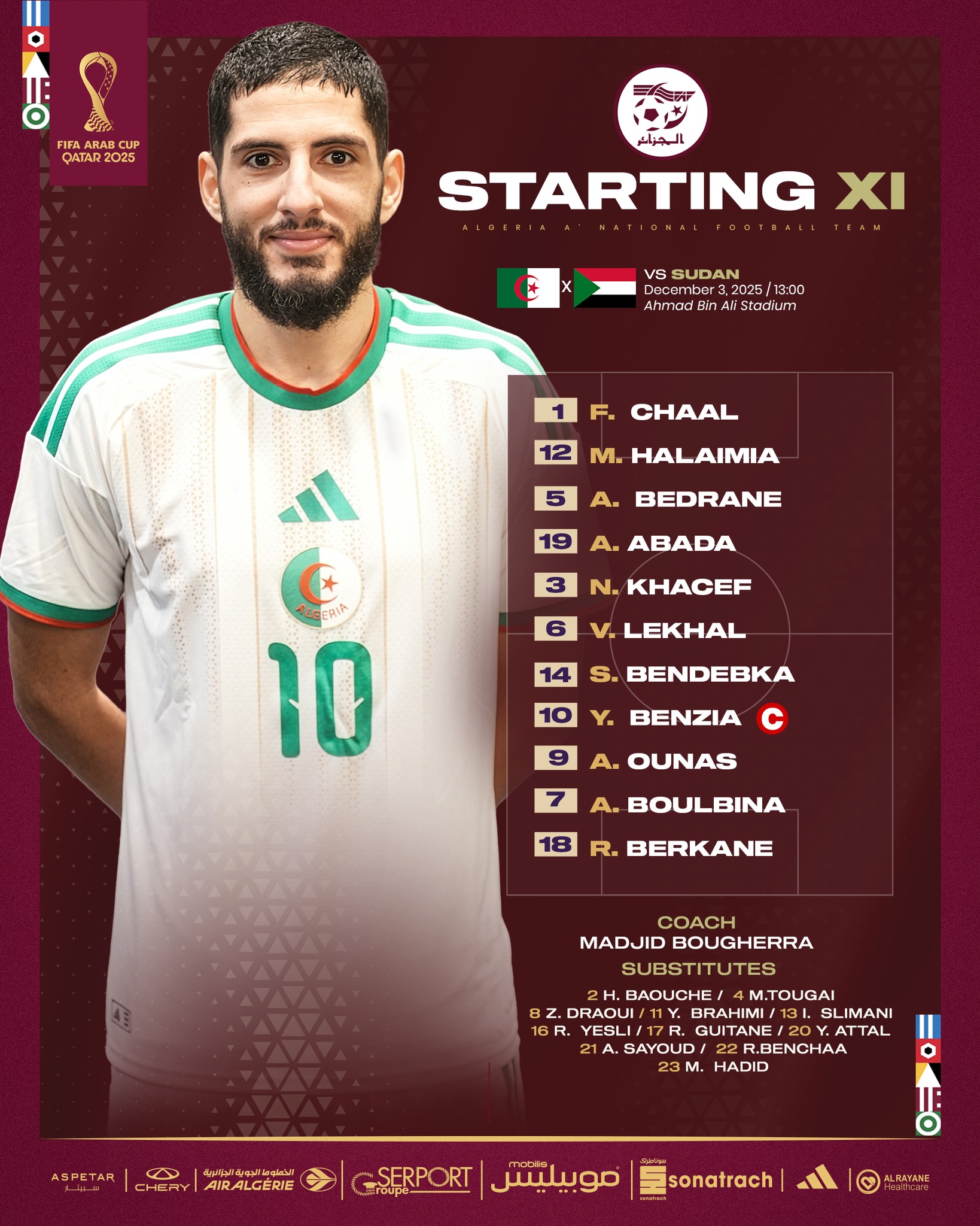 Madjid Bougherra a dévoilé son onze pour affronter le Soudan, avec Yassine Benzia capitaine. Ounas, Boulbina et Berkane animeront l’attaque, tandis que Bendebka et Lekhal assureront l’équilibre. Chaâl débute dans les buts pour cette première sortie en Coupe Arabe.
