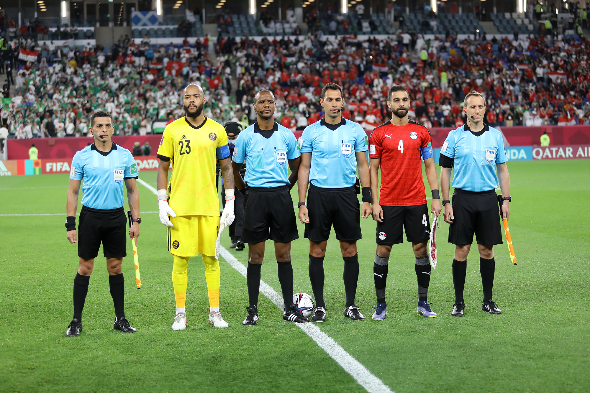 Sans Mohamed Magdy (Afsha), les Égyptiens se présentaient sur la pelouse du stade d’Al-Janoub sans un élément important. Et le début du match n’a pas vraiment arrangé les choses avec des sorties sur blessures de Ayman Ashraf (9’) puis l’expérimenté Hegazy (31’).