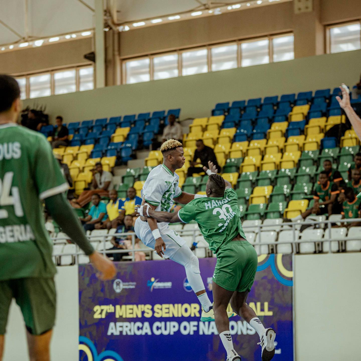 Malgré un départ probant dans cette rencontre, match équilibré, les coéquipiers de Messaoud Berkous perdent pied en fin de 1ère mi-temps. Les Green Eagles marquent coup sur coup 3 buts. A la mi-temps les vice-champions d’Afrique vacillent et sont menés13-16. La 2ème période est lancée. Seuls Abdi et Saker réagissent. Mais le Nigéria garde son écart jusqu’à (+4). Les Verts réduisent quand même l’écart en fin de match. Défaite 23-25.