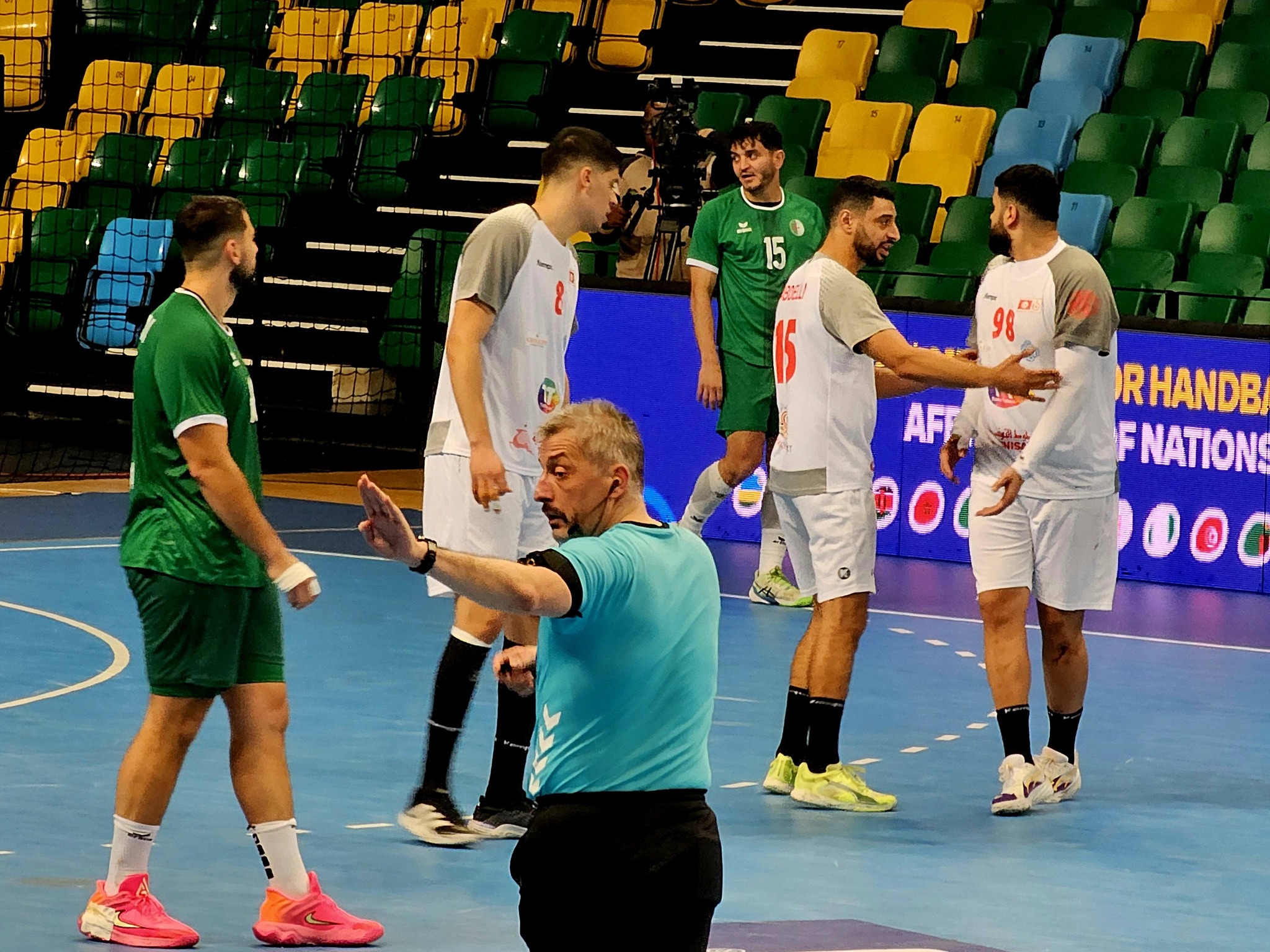 Il n’aura suffi que de cinq minutes à la Tunisie pour éteindre les espoirs algériens. Alors que le score était de 3-3, les Verts retombent dans leurs travers habituels : un jeu offensif trop lent, une inefficacité préoccupante devant le but et surtout de nombreuses largesses défensives. Autant de failles exploitées par les Tunisiens, qui creusent rapidement l’écart jusqu’à 13-5. Pendant que le gardien tunisien Mehdi Harbaoui multiplie les arrêts, son homologue algérien Khelifa Ghedhbane assiste, impuissant, aux tremblements de ses filets. À la fin de la première période, la Tunisie mène largement 19-11.