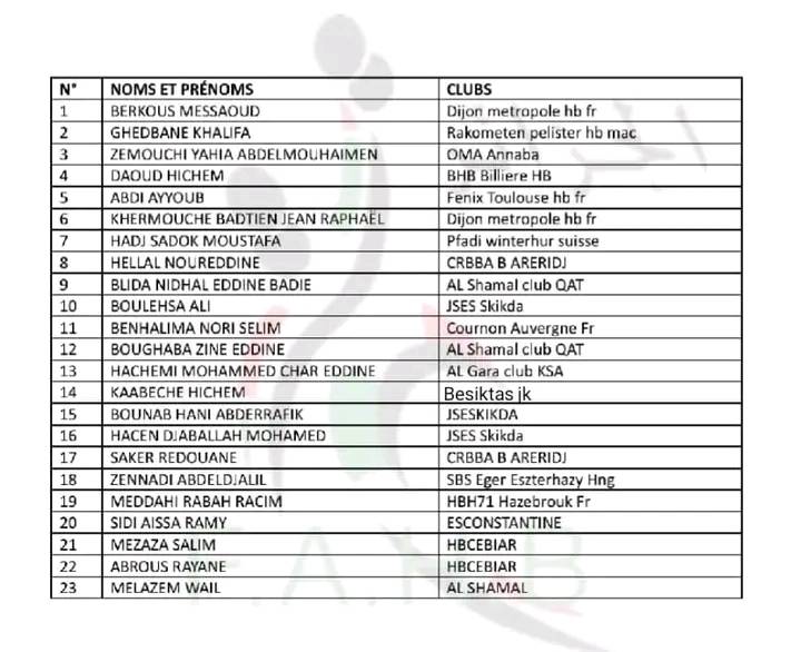 A peine remis de ses émotions continentales que revoilà Farouk Dehili plongé dans un autre casse-tête, mais celui-ci est mondial ! En effet le coach d’Al Shamal et de la sélection algérienne doit préparer le tournoi qualificatif des JO de Paris 2024. Dans cet objectif, la fédération algérienne de handball a organisé un premier regroupement du 10 au 12 mars à Alger. Pour ce stage, Dehili a fait appel à la majorité des joueurs ayant participés à la dernière CAN. Ainsi on retrouve dans la liste les joueurs cadres tels que Berkous, Daoud, Kaâbache, Abdi, Hadj-Sadok ou encore le gardien Ghedhbane. On retrouve aussi la nouvelle génération montante telle que Hellal, Melazem, Bouneb ou Abrous. On voit aussi le retour de Benhalima après sa blessure au genou qui l’a empêchée de participer au championnat africain.