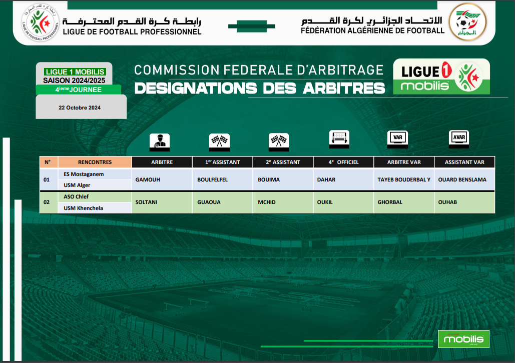 La Fédération algérienne de football (FAF) précise que la VAR sera présente aux stades Bensaid de Mostaganem et Mohamed Boumezrag de Chlef. Concernant les arbitres, la commission d’arbitrage a désigné le trio Gamouh, Boulfelfel et Bouima pour diriger le match entre l’ES Mostaganem et l’USMA, tandis que Tayeb Bouderbal sera à la tête de la VAR avec l’aide de Ouard Benslama.