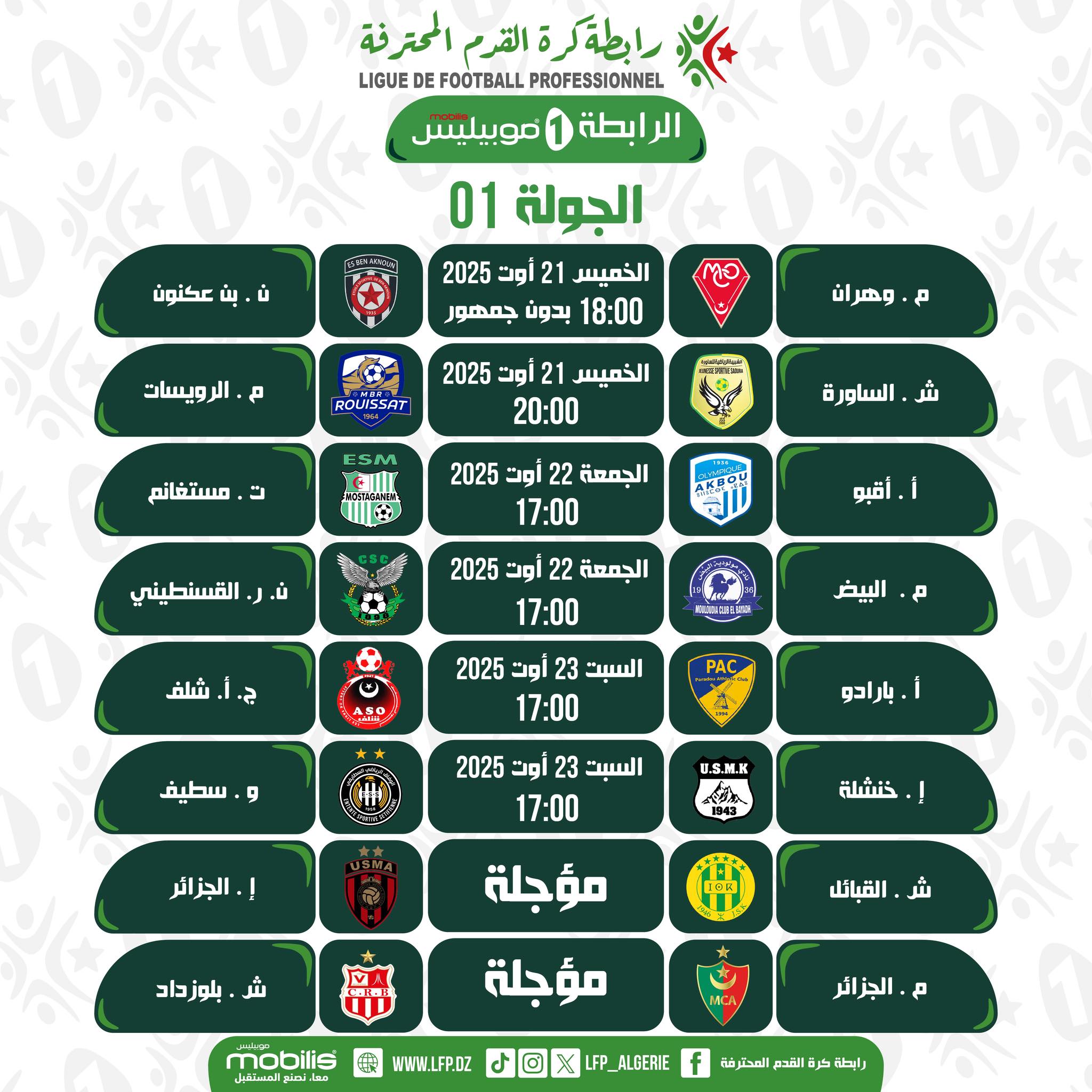 La nouvelle saison de la Ligue 1 Mobilis 2025-2026 débutera ce jeudi 21 août 2025 par deux rencontres reportées, et pas des moindres !